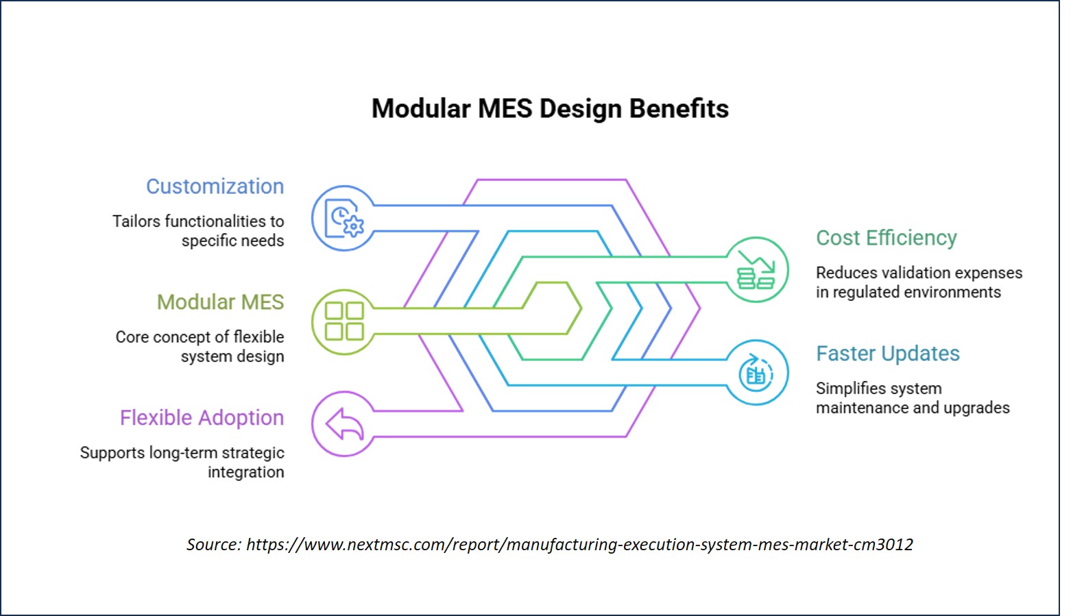 Modular MES designs allow manufacturers to deploy only the functionalities they require particularly valuable in regulated spaces, where validating entire systems can be costly. Modular architectures support faster updates, easier customization, and more flexible long term adoption strategies.