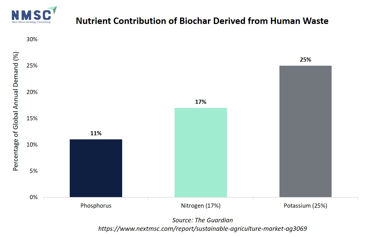 The study estimated that biochar produced from solid human waste could supply up to 7% of the global annual phosphorus demand. While the biochar process only processes solids, nutrients from urine can be incorporated, potentially covering 15% of yearly phosphorus needs, 17% of nitrogen, and up to 25% of potassium requirements.
