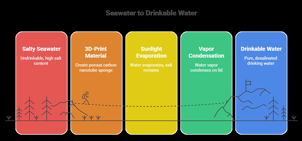 In an outdoor experiment, the researchers positioned the material inside a cup filled with seawater and covered it with a curved, transparent plastic lid. Sunlight warmed the surface of the sponge-like material, causing only the water to evaporate while leaving the salt behind. The water vapor then condensed on the plastic cover, flowing to the edges where it dripped into a funnel and collected in a container beneath the cup. After six hours of exposure to natural sunlight, the system produced approximately three tablespoons of drinkable water.