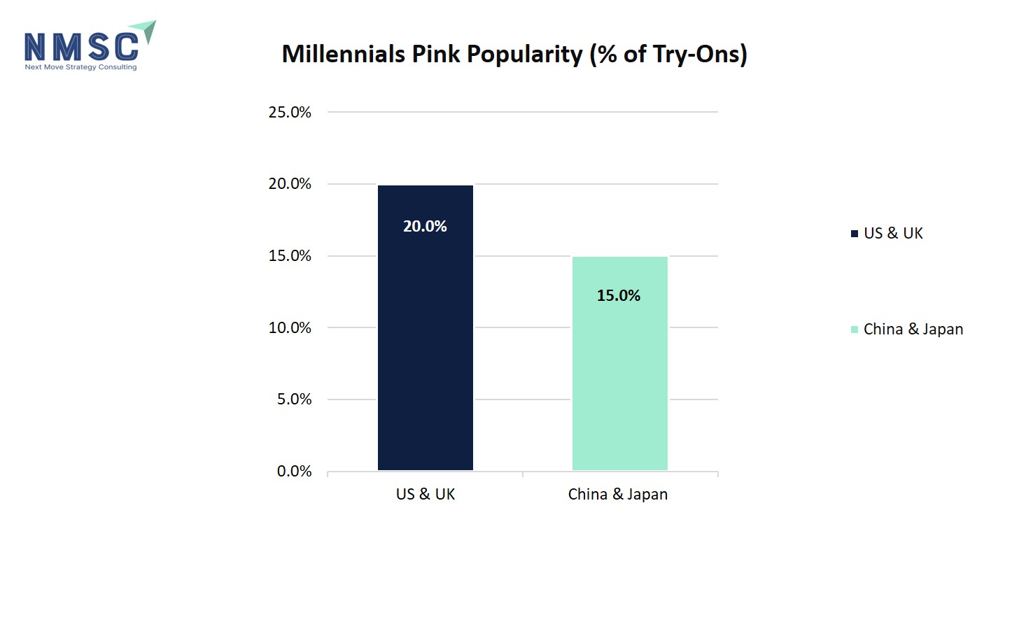 Millennial Pink Reigns: Most popular globally. Over 20% of try-ons in the US & UK, 15% in China & Japan.