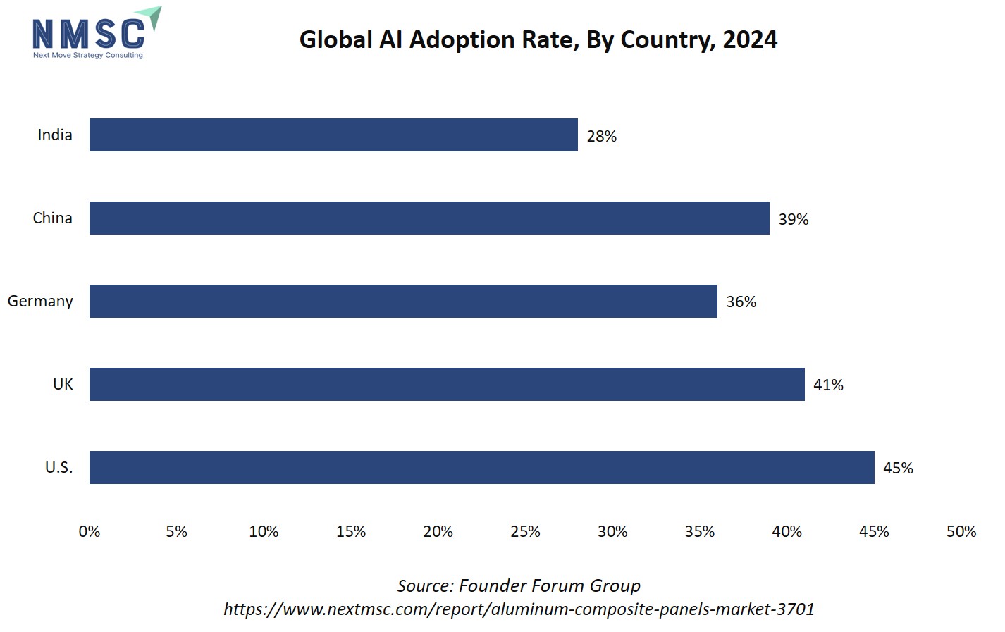 The above chart captures the global AI adoption rate across major countries. The prominent U.S. adoption rate reflects widespread integration of artificial intelligence in industries such as construction, architecture, and manufacturing, driving transformation in design, efficiency, and performance standards.