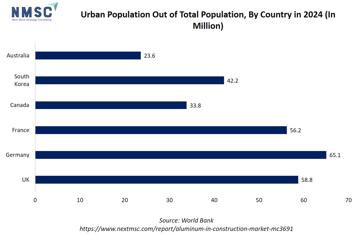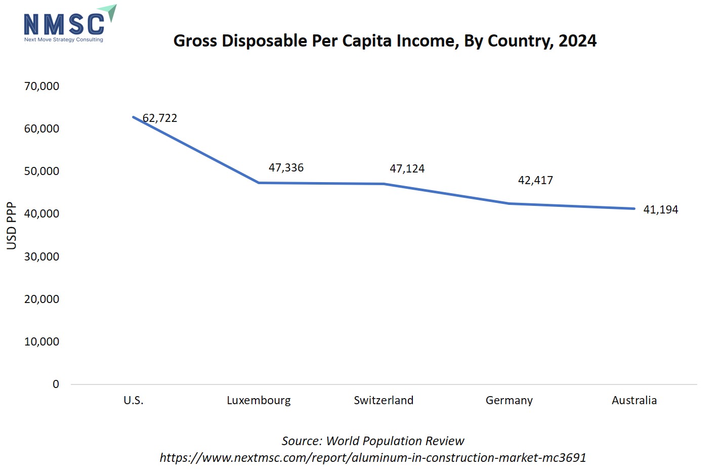 The above chart depicting gross disposable per capita income across countries highlights the purchasing power of key markets for aluminum in construction. Higher disposable income, such as in the U.S., Luxembourg, and Switzerland, supports greater investment in premium construction materials, including lightweight, durable, and sustainable aluminum solutions for commercial, residential, and infrastructure projects. Overall, these income patterns help industry players prioritize markets with strong spending capacity while tailoring product offerings to meet affordability, sustainability, and performance expectations, thereby influencing strategic expansion, adoption rates, and investment planning in the aluminum construction sector.