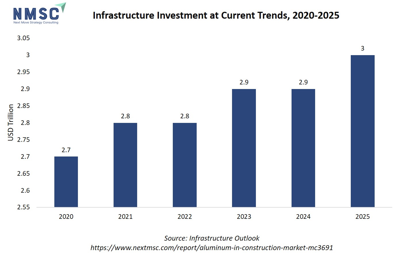 The projected rise in global infrastructure investment signals a significant positive impact on the aluminum in construction market, as this surge in public and private spending on projects like transportation networks, bridges, and public buildings will substantially increase demand for aluminum due to its essential role in modern structural frameworks, façades, and building systems prized for their strength, light weight, and corrosion resistance.