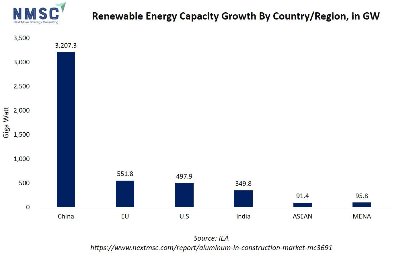 The explosive growth in renewable energy capacity depicted in the chart, led by China, the EU, and the U.S., directly fuels a parallel boom in the aluminum in construction market, as this expansion necessitates the massive deployment of solar farms, wind turbines, and upgraded grid infrastructure, all of which are heavily dependent on aluminum for the construction of durable, lightweight, and corrosion-resistant mounting systems, structural frames, and conductive transmission lines, making the metal a fundamental enabler of the global clean energy transition.