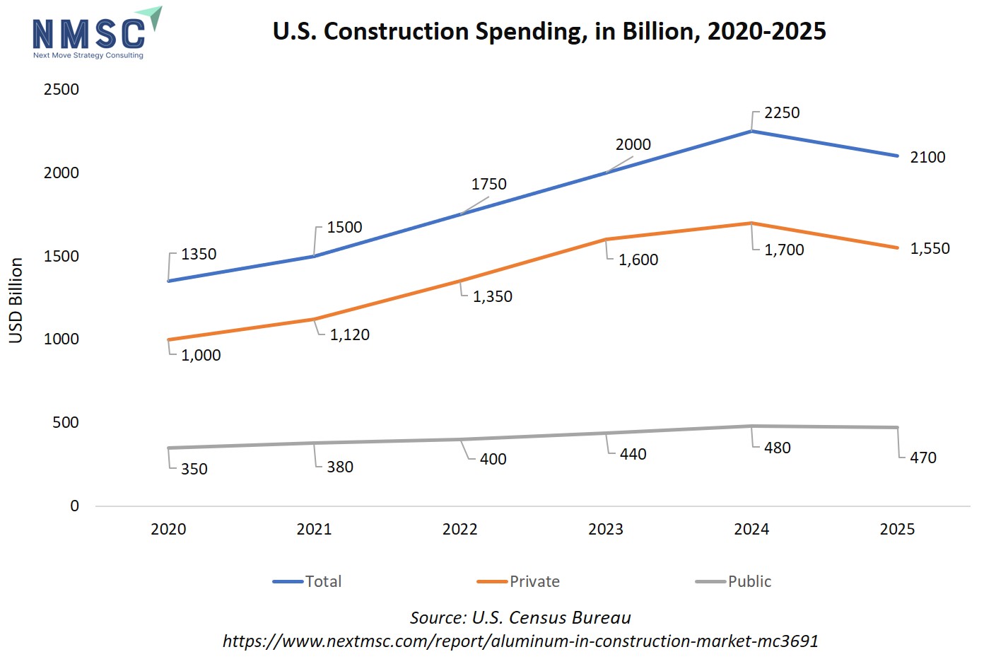 The chart depicting a substantial and consistent rise in U.S. construction spending from 2020 to 2025, driven by growth in both private and public sectors, directly stimulates the aluminum in construction market by creating robust demand for the metal across a wide range of projects, from commercial and residential buildings (private) to infrastructure and public facilities, where aluminum is extensively used for structural components, curtain walls, windows, and roofing due to its durability, design flexibility, and sustainability.