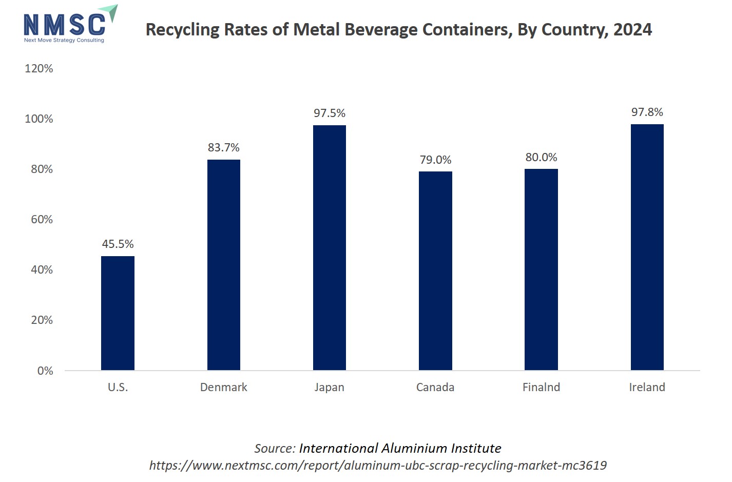 The above chart shows the percentage of metal beverage containers separated for recycling in 2024 across six countries, with Ireland (97.8%) and Japan (97.5%) achieving the highest separation rates, followed by Denmark (83.7%), Finland (80.0%), and Canada (79.0%), while the U.S. lags at just 45.5%. This significant variation impacts the aluminum Used Beverage Can (UBC) scrap recycling market, as higher separation rates directly increase the supply and quality of UBC scrap available to recyclers, thereby fueling the aluminum UBC scrap recycling market growth, enabling efficient recycling operations, and supporting investments in recycling infrastructure; meanwhile, countries like the U.S. with lower rates face constraints in feedstock supply, which can hinder the scale and cost-effectiveness of UBC recycling and limit the environmental and economic benefits that aluminum recycling offers.