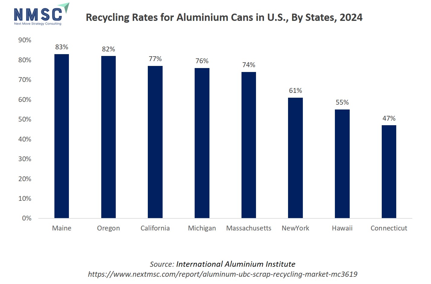 The above chart displays aluminum can recycling rates across various U.S. states in 2024, with Maine (83%), Oregon (82%), California (77%), Michigan (76%), and Massachusetts (74%) leading, while New York (61%), Hawaii (55%), and Connecticut (47%) lag notably behind. States with higher recycling rates provide abundant, high-quality feedstock for the aluminum UBC scrap recycling market, supporting efficient recycling operations and economic viability. In contrast, states with lower rates represent untapped potential but also indicate barriers such as lack of infrastructure or incentives. Overall, these disparities directly influence regional strengths and expansion opportunities in the UBC recycling market.