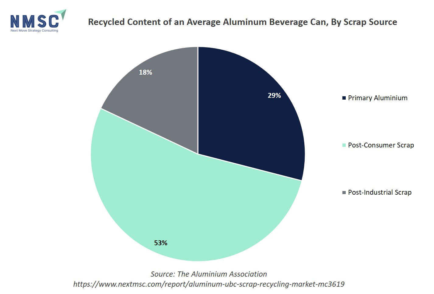 The above chart reveals that an average aluminum beverage can contain 53% post-consumer scrap, 18% post-industrial scrap, and only 29% primary aluminum. This high proportion of recycled content demonstrates the strong circularity and sustainability of aluminum cans, largely due to robust Used Beverage Can scrap recovery and utilisation. The dominance of recycled material lowers production costs, saves substantial energy (up to 80% versus primary production), and encourages continued investment in UBC scrap recycling infrastructure and programs, directly supporting market growth as demand rises for greener packaging and closed-loop supply chains.