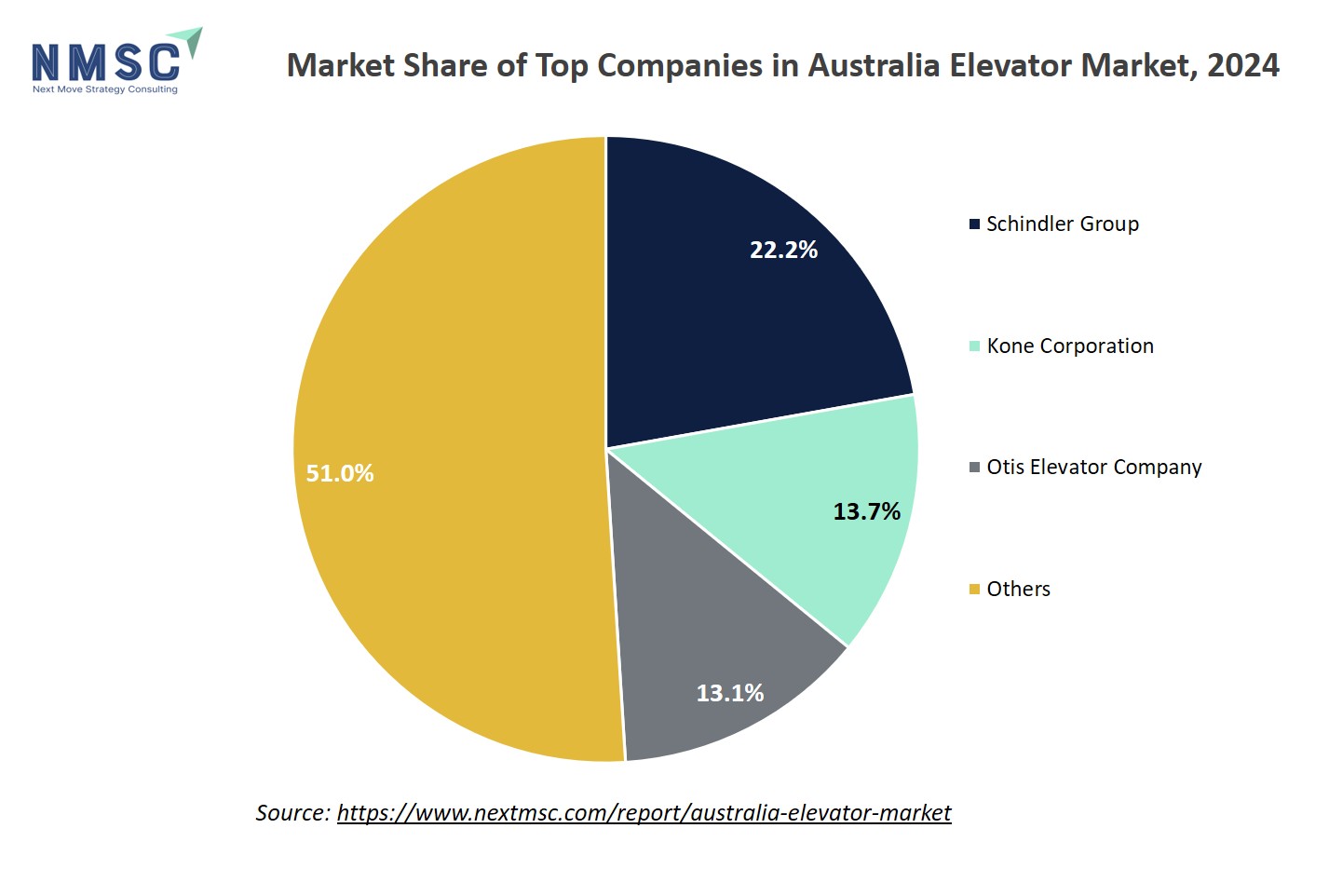The Australia elevator market is led by major players such as Schindler Group, TK Elevator, Mitsubishi Electric Corporation, Otis Elevator Company, Kone Corporation, and Hitachi. These companies are driving growth through consistent innovation and strong investment in research and development. Their strategies focus on enhancing elevator technology with smart systems, including AI-powered diagnostics, predictive maintenance, and energy-efficient designs. To remain competitive, these firms are also adopting modular and cloud-based platforms that support faster deployment and customization across different building types.