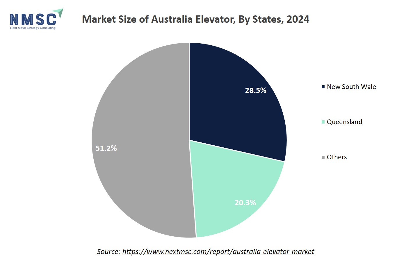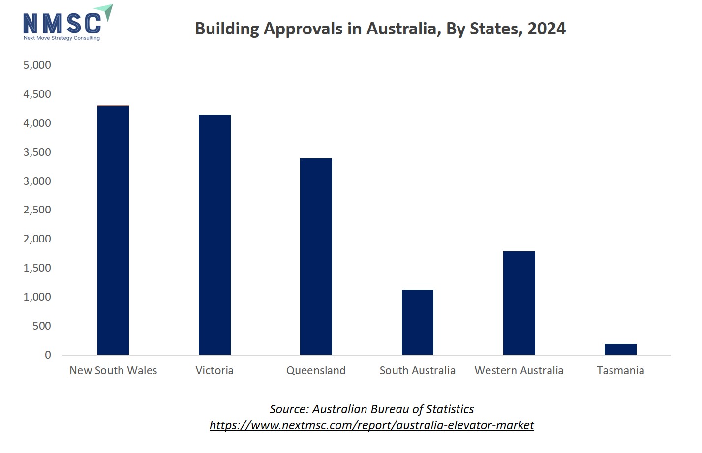 The above chart illustrates the distribution of building approvals across Australian states in 2024 and highlights its direct relevance to the country’s elevator market. New South Wales records the highest number of approvals, followed by Victoria and Queensland, reflecting strong urban growth and housing demand in these populous states, while Western Australia and South Australia show moderate activity and Tasmania records the lowest. Building approvals serve as a leading indicator of elevator demand, as many of these projects involve multi-storey residential, commercial, and mixed-use developments that require elevators for accessibility and compliance. As urban centres densify, the correlation between new constructions and elevator installations strengthens, creating significant growth opportunities for elevator manufacturers, service providers, and maintenance companies nationwide.