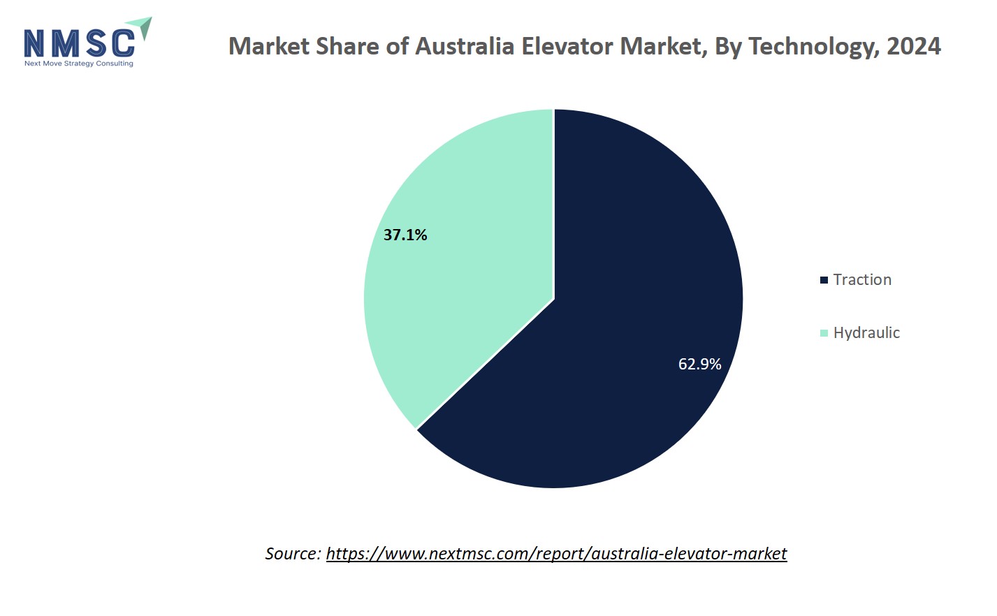 Based on technology, the Australia elevator market is segmented into traction and Hydraulic.