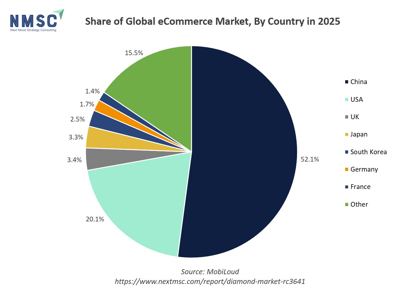 E-commerce is an increasingly important driver of the market, as it expands consumer access to both natural and lab-grown diamonds, particularly in regions where physical retail presence be limited. In 2025, China dominates global e-commerce with a 52.1% share, followed by the USA at 20.1%, while the UK and Japan account for 3.4% and 3.3%, respectively. South Korea, Germany, and France hold smaller shares of 2.5%, 1.7%, and 1.4%, with the remaining countries collectively representing 15.5%. The high penetration of e-commerce in China and the USA facilitates convenient online purchases of diamonds, including certified jewelry and customized options, and also allows brands to reach younger, tech-savvy consumers. Although Europe and other regions have smaller e-commerce shares, the growing adoption of online platforms supports the expansion of branded retail, digital marketing, and personalized diamond offerings, making e-commerce a key enabler of global diamond market growth.