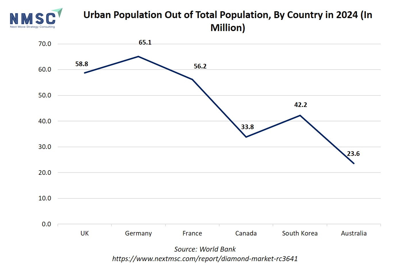 Urbanization is a significant driver of the market, as higher urban populations increase exposure to luxury goods, branded retail outlets, and modern jewelry trends. In 2024, Germany, with an urban population of 65.05 million, leads the group, followed by the United Kingdom at 58.76 million, and France at 56.21 million, indicating that a majority of their populations reside in urban centers. South Korea and Canada have moderately urbanized populations at 42.17 million and 33.84 million, respectively, while Australia has the lowest urban population among the listed countries at 23.60 million. These urban populations are more likely to purchase diamonds for personal adornment, gifts, and premium occasions, benefiting both natural and lab-grown diamond segments. High urbanization also supports the growth of branded retail stores, e-commerce platforms, and organized distribution channels, making diamonds more accessible to a concentrated consumer base. In contrast, countries with lower urbanization see slower ad