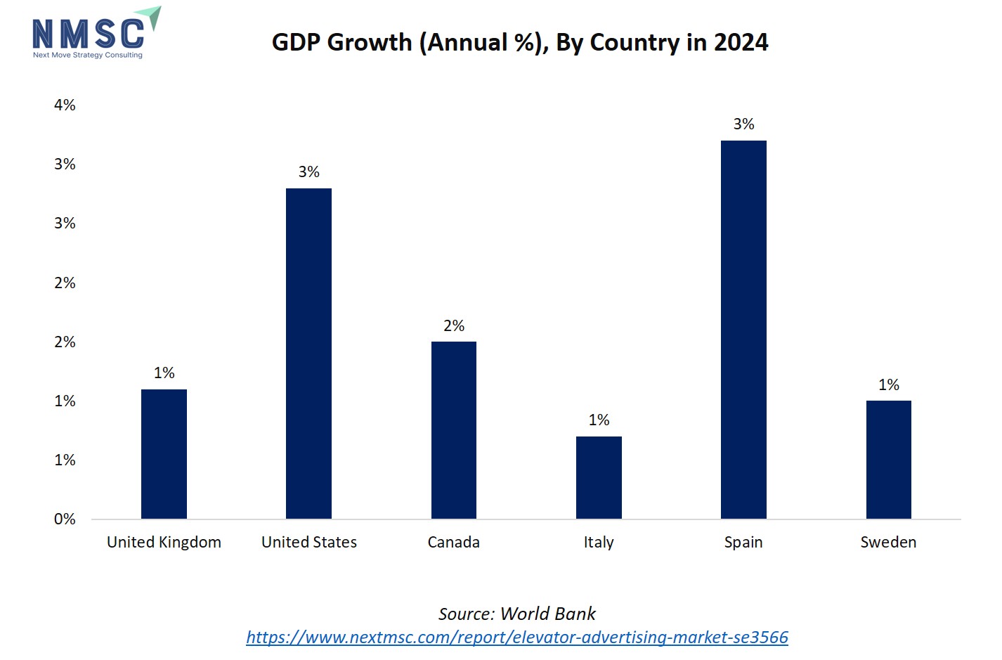 The chart illustrates annual GDP growth rates in 2024 across selected countries, highlighting Spain with the highest growth at 3.20%, followed by the United States at 2.80%, Canada at 1.50%, the United Kingdom at 1.10%, Sweden at 1.00%, and Italy at 0.70%. Stronger GDP growth reflects healthier economic activity, higher consumer spending, and increased business investment, all of which directly support the elevator advertising market expansion. Rapidly growing economies, such as Spain and the U.S., are more likely to see rising demand for advertising in commercial buildings, shopping centers, hotels, and residential complexes. Conversely, markets with slower GDP growth, like Italy and Sweden, adopt elevator screen advertising at a steadier pace but still provide opportunities through targeted, cost-effective campaigns. Overall, robust GDP growth correlates with greater construction activity, expanding retail and hospitality sectors, and higher advertising budgets, reinforcing the role of elevator advertising as a strategic medium in urban economies.