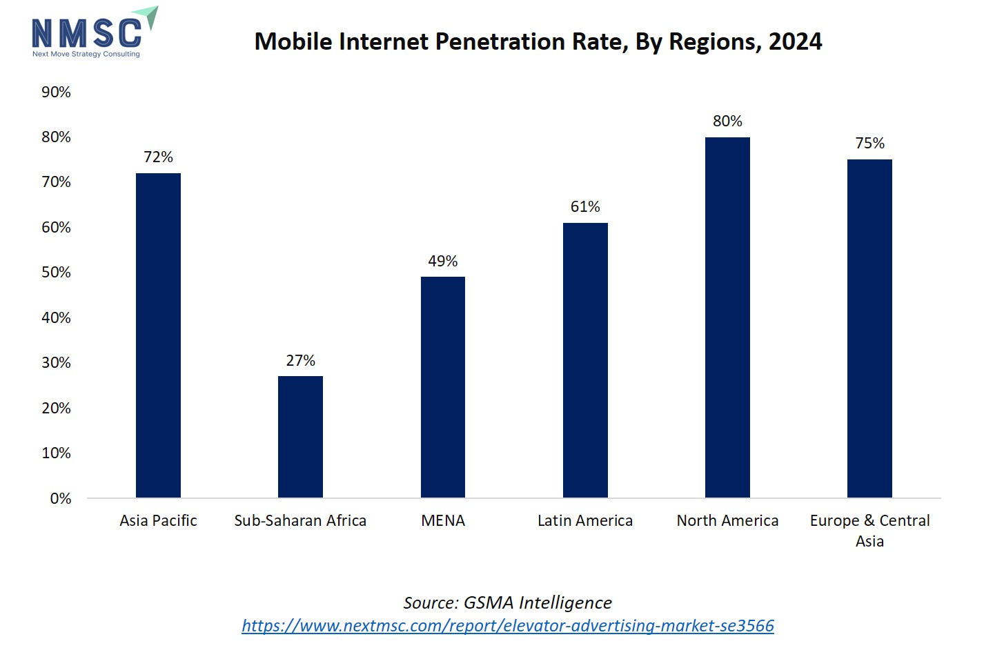 The chart highlights mobile internet penetration across regions in 2024, with North America (80%) and Europe & Central Asia (75%) showing the highest connectivity levels. This widespread mobile access supports the expansion of programmatic elevator advertising, allowing for real-time, data-driven content delivery to urban audiences. In the Asia Pacific (72%) and Latin America (61%), growing mobile internet usage indicates increasing potential for connected elevator screens in commercial and residential buildings. Even in the MENA region (49%) and Sub-Saharan Africa (27%), rising mobile connectivity suggests emerging opportunities for digital elevator advertising, particularly as urbanization and smartphone adoption continue to increase. High mobile internet penetration enhances engagement with dynamic, location-specific ads, making digitally connected elevators an effective medium in both mature and developing markets.