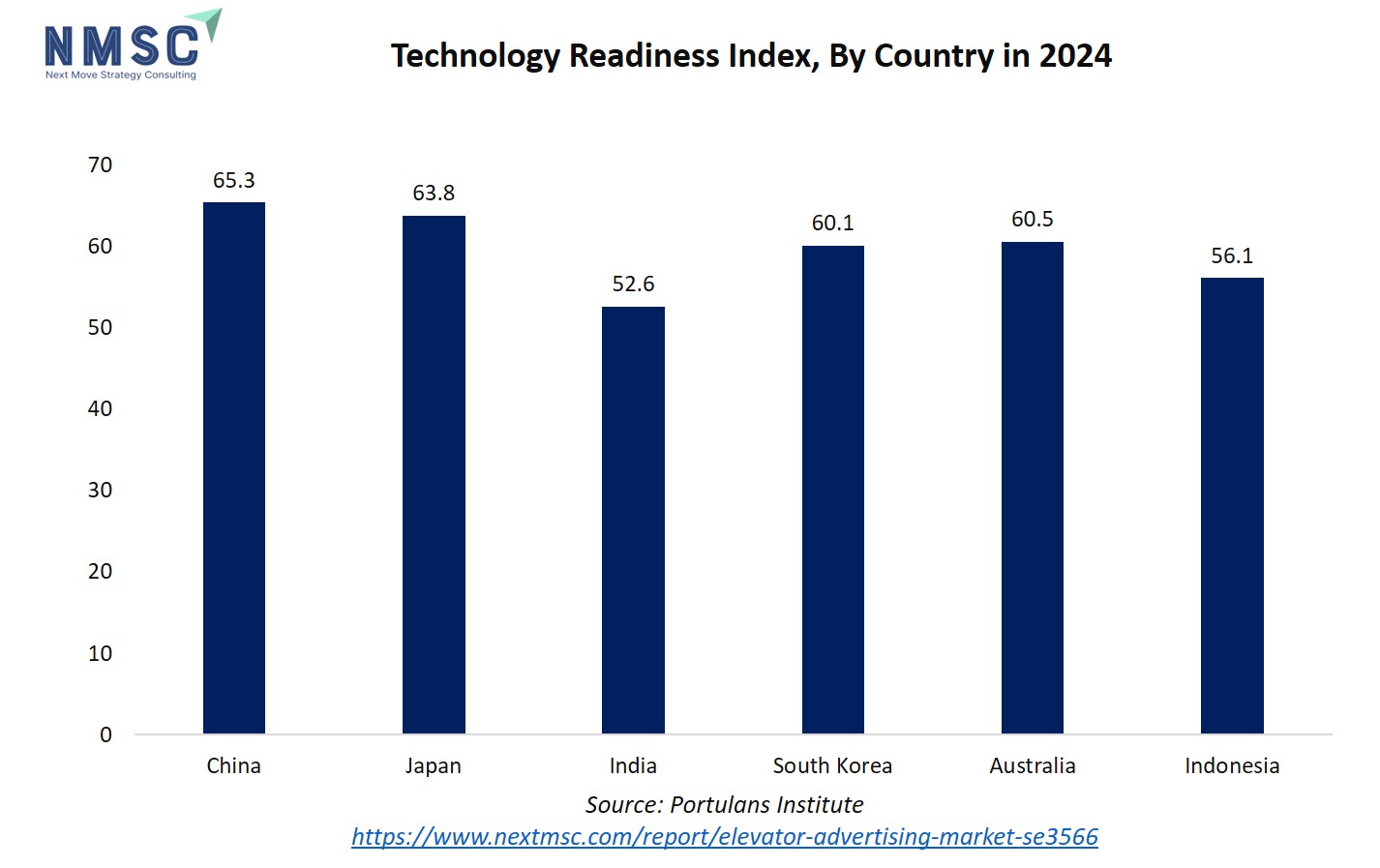 In 2024, the technology readiness index (TRI) scores across key Asia-Pacific countries indicate varying levels of digital infrastructure and innovation capacity relevant to the elevator advertising market. China leads with a TRI score of 65.34, followed by Japan (63.78), Australia (60.54), South Korea (60.10), Indonesia (56.08), and India (52.56). Higher TRI scores reflect stronger technological infrastructure, digital adoption, and readiness for connected and programmatic advertising solutions. Countries like China, Japan, South Korea, and Australia are better positioned to implement interactive and data-driven elevator advertising campaigns, leveraging IoT-enabled and smart building integrations. In contrast, markets with lower TRI scores, such as India and Indonesia, present growth opportunities as digital infrastructure improves. Overall, technology readiness directly influences the adoption of advanced elevator advertising formats, the effectiveness of dynamic content delivery, and the potential for real-time, audience-targeted campaigns, making high-TRI regions strategic priorities for market expansion.
