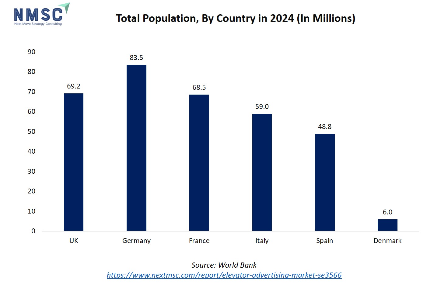 The bar chart above illustrates the total population (in millions) across countries in 2024, including Germany (83.51 Mn), the UK (69.22 Mn), France (68.51 Mn), Italy (58.98 Mn), Spain (48.80 Mn), and Denmark (5.97 Mn). These countries feature significant populations, many of which are concentrated in urban areas, providing a substantial captive audience for elevator advertising. Highly populated nations like Germany, the UK, and France represent key markets for deploying digital screens, static displays, interactive panels, and other elevator-based media in offices, shopping centers, residential complexes, and hotels. The combination of large populations and increasing urbanization makes these regions strategically important for expanding elevator advertising campaigns and reaching diverse consumer segments.