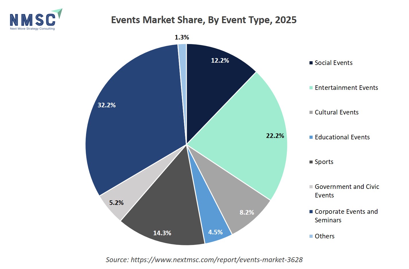 The chart displays the events market segmentation by event type for 2025, revealing that corporate events and seminars comprise the largest share at 32.2%, followed by entertainment events at 22.2%, sports at 14.3%, and social events at 12.2%. Other segments such as cultural events (8.2%), government and civic events (5.2%), educational events (4.5%), and a small "others" category (1.3%) contribute smaller shares. This distribution highlights the predominance of corporate, entertainment, and sports events as the central drivers of growth and activity in the global market.