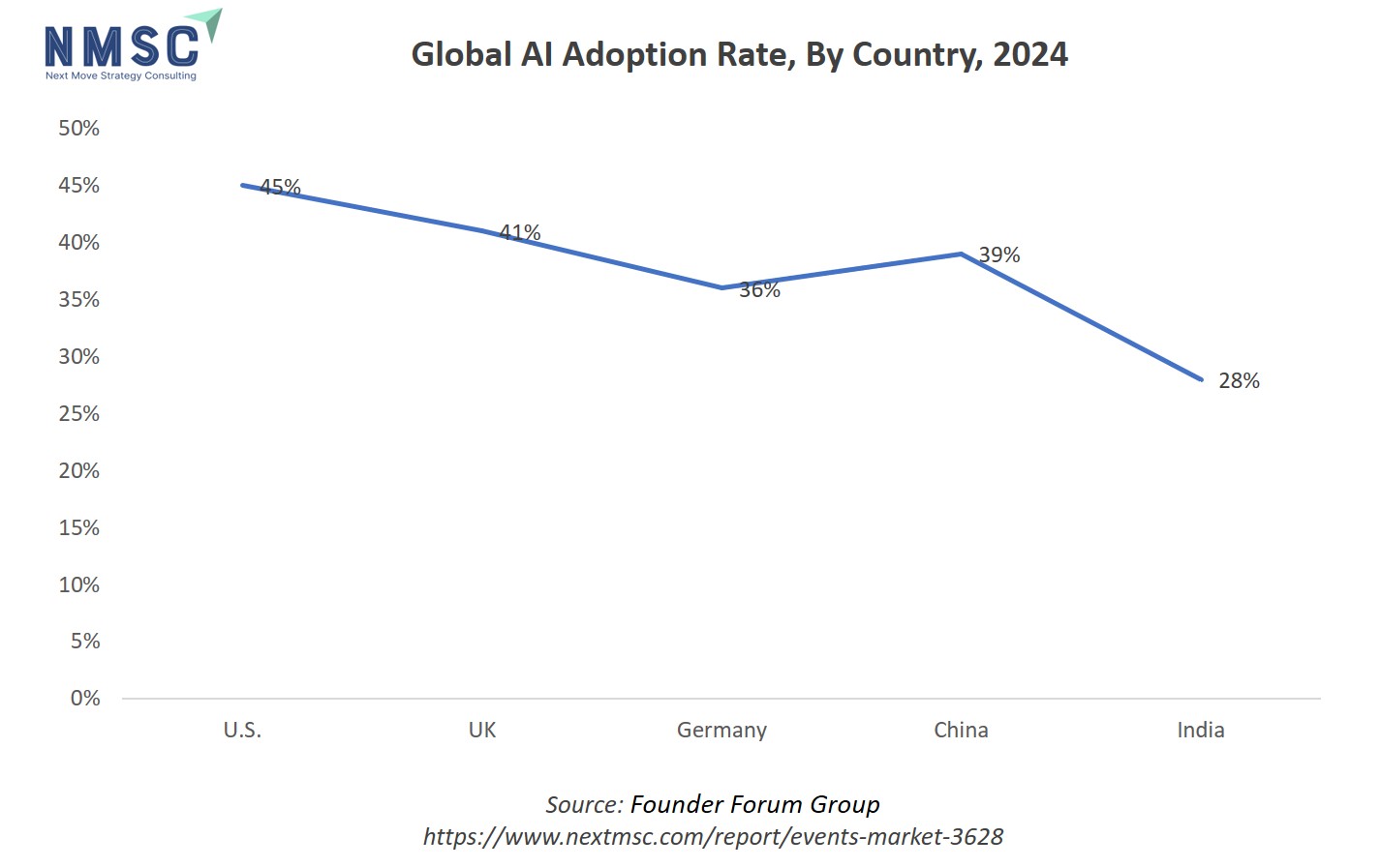 The chart presents the global AI adoption rate by country for 2024, showing the U.S. leading at 45%, followed by the UK at 41%, China at 39%, Germany at 36%, and India lagging behind at 28%. This data highlights notable regional differences, with Western countries demonstrating higher AI adoption rates compared to India, indicating advanced integration of artificial intelligence in their industries and economies