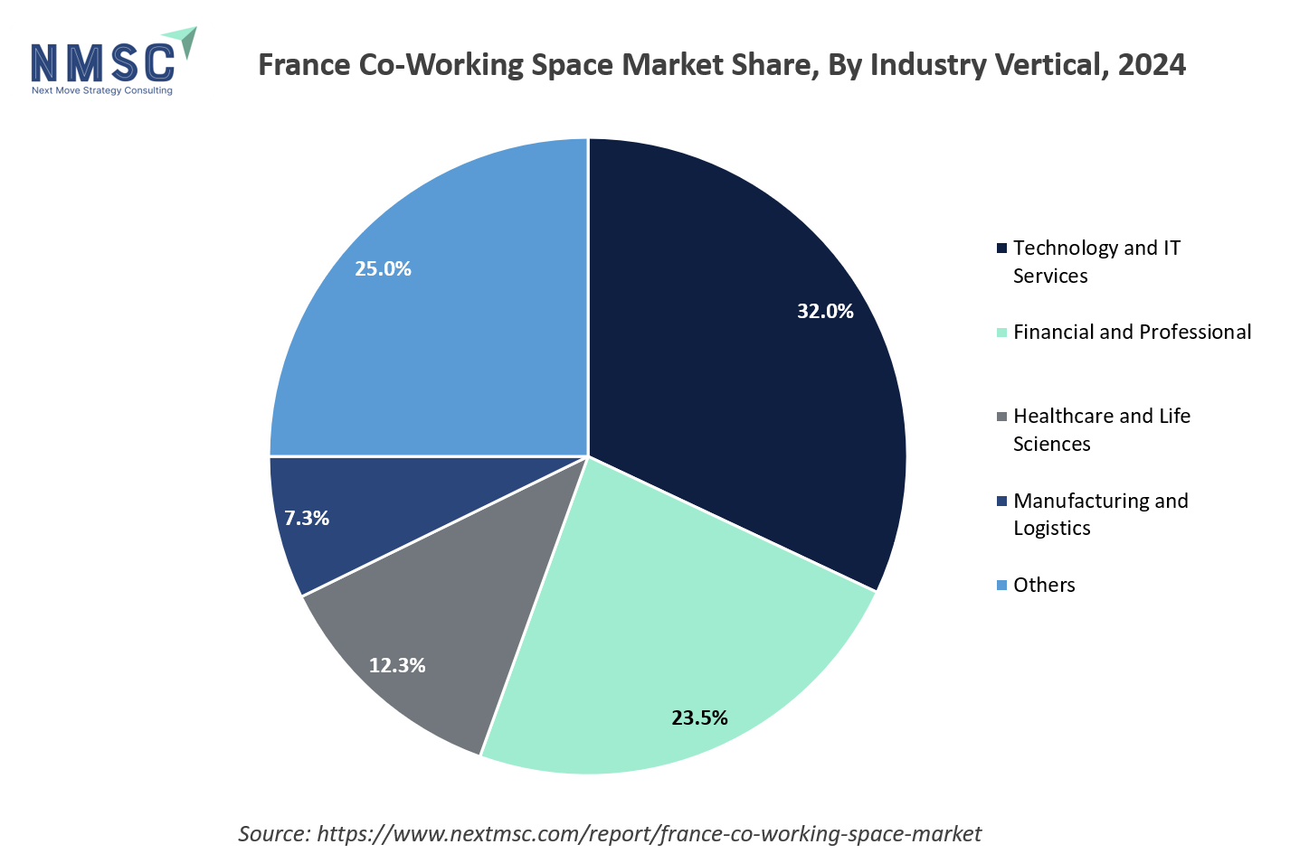 The chart highlights how adoption varies across sectors in France Co-Working Space. Technology and IT services lead with 32.0%, reflecting the sector’s strong reliance on flexible, innovation-driven work environments that support startups, scale-ups, and remote teams. Similarly, the financial and professional services sector follows at 23.5%, driven by consulting firms, legal services, and agile finance teams seeking cost-efficient yet professional office solutions.