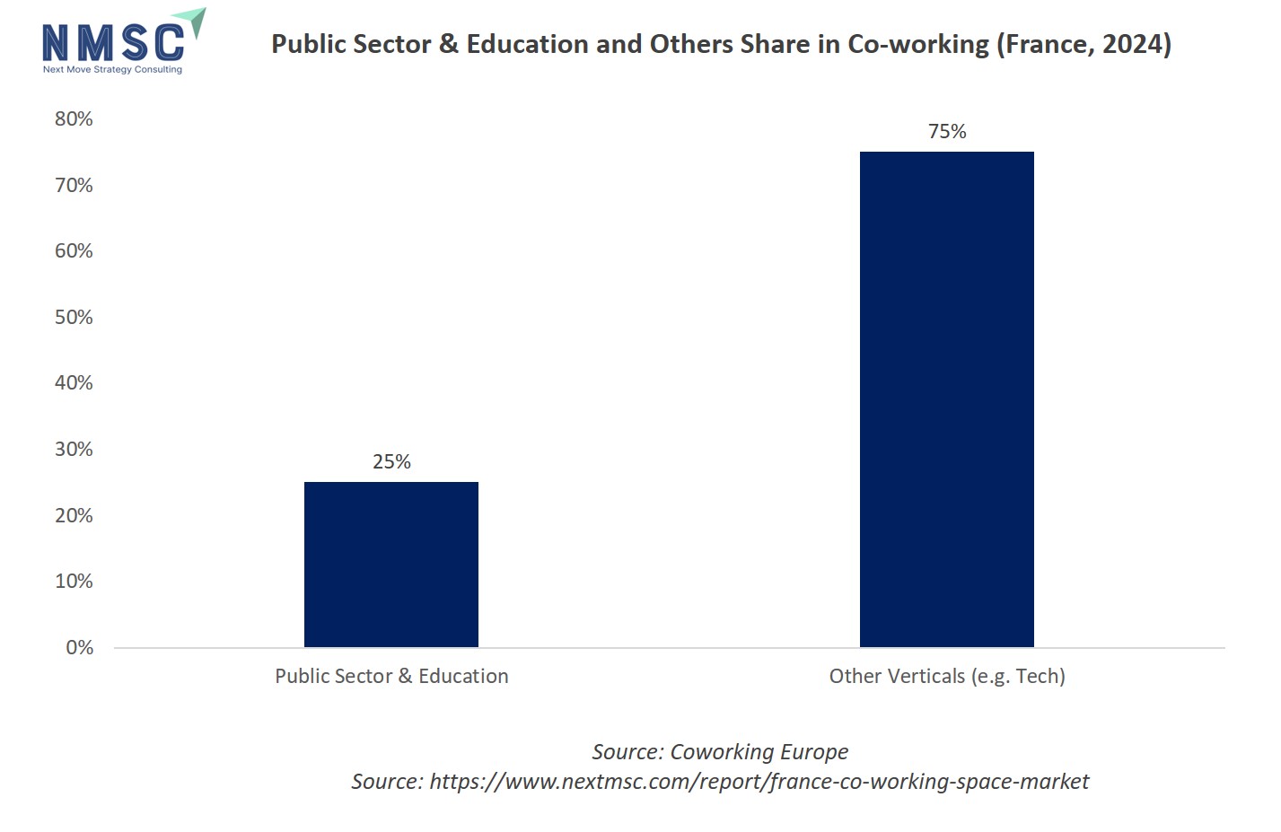 The above chart illustrates the share of Public Sector & Education versus other verticals in France’s co-working market in 2024. Public Sector & Education accounts for 25%, highlighting the growing institutional adoption of flexible workspaces as government bodies, universities, and training institutions increasingly use co-working environments to foster collaboration and innovation. In contrast, other verticals, including technology, represent 75%, showing that while co-working remains dominated by private-sector demand, the inclusion of the public sector is becoming a notable driver of diversification. This trend reflects a broader shift in France where co-working is no longer confined to startups and tech firms but is evolving into a mainstream workplace solution across multiple industries.