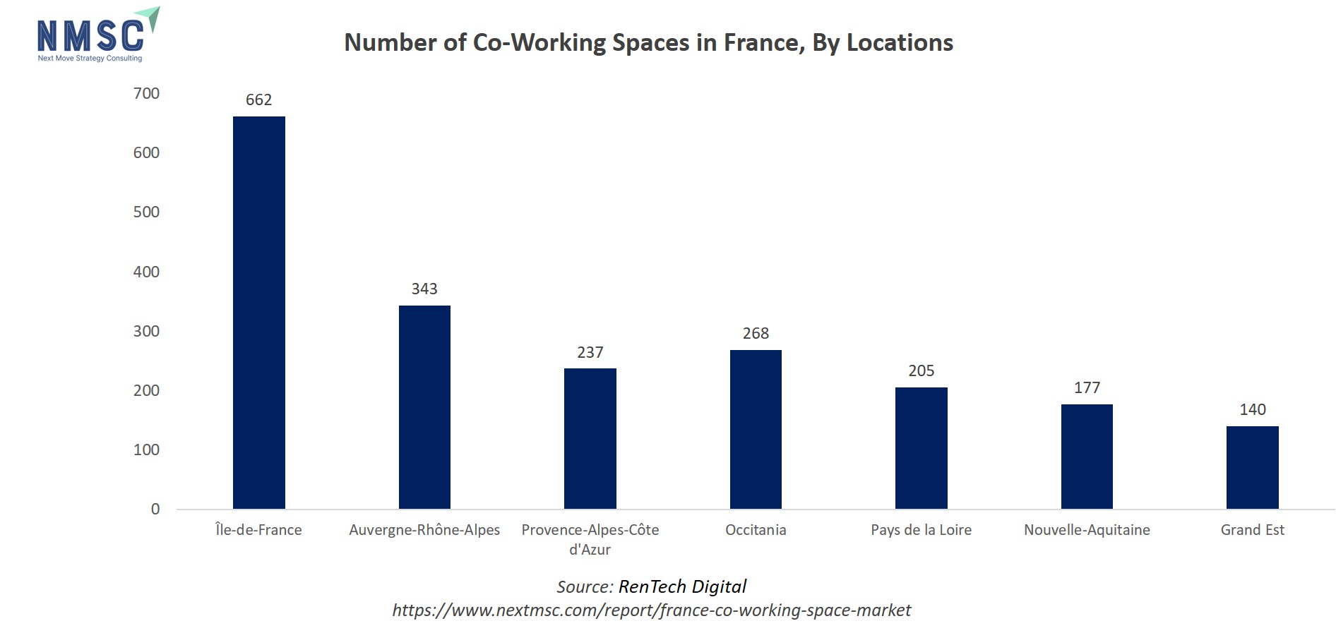 The above chart illustrates the distribution of co-working spaces across key regions in France, highlighting significant regional variations. Île-de-France leads by a wide margin with 662 co-working spaces, reflecting Paris’s dominance as the country’s primary business hub. Auvergne-Rhône-Alpes follows with 343 spaces, while Provence-Alpes-Côte d’Azur and Occitania record 237 and 268 spaces respectively, showcasing strong coworking adoption in southern France. Mid-tier regions include Pays de la Loire with 205 spaces and Nouvelle-Aquitaine with 177, whereas Grand Est hosts 140 spaces. Overall, the data emphasizes the central role of Île-de-France in coworking growth while also pointing to expanding regional hubs that contribute to France’s evolving flexible workspace market.