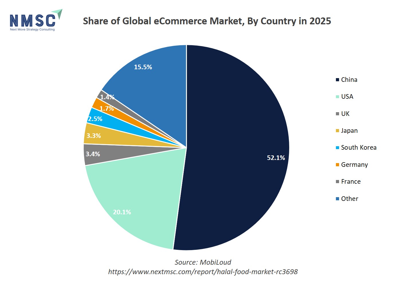 The pie chart depicts the global e-commerce market share by country in 2025. China dominates the market with a 52.1% share, accounting for over half of global e-commerce activity. The USA follows with 20.1%, while the UK and Japan contribute 3.4% and 3.3%, respectively. South Korea, Germany, and France hold smaller shares of 2.5%, 1.7%, and 1.4%, respectively. The remaining countries collectively represent 15.5% under the “Other” category. With the rapid growth of online retail, Halal food brands leverage these digital channels to reach a wider international audience, including non-traditional markets where demand for Halal products is emerging. Countries with smaller e-commerce shares, such as the UK, Japan, South Korea, Germany, and France, still represent niche markets with growing interest in specialty and ethically sourced foods. Overall, the expansion of e-commerce accelerates global market penetration, improves product accessibility, and enables Halal food brands to engage digitally savvy consumers across regions.