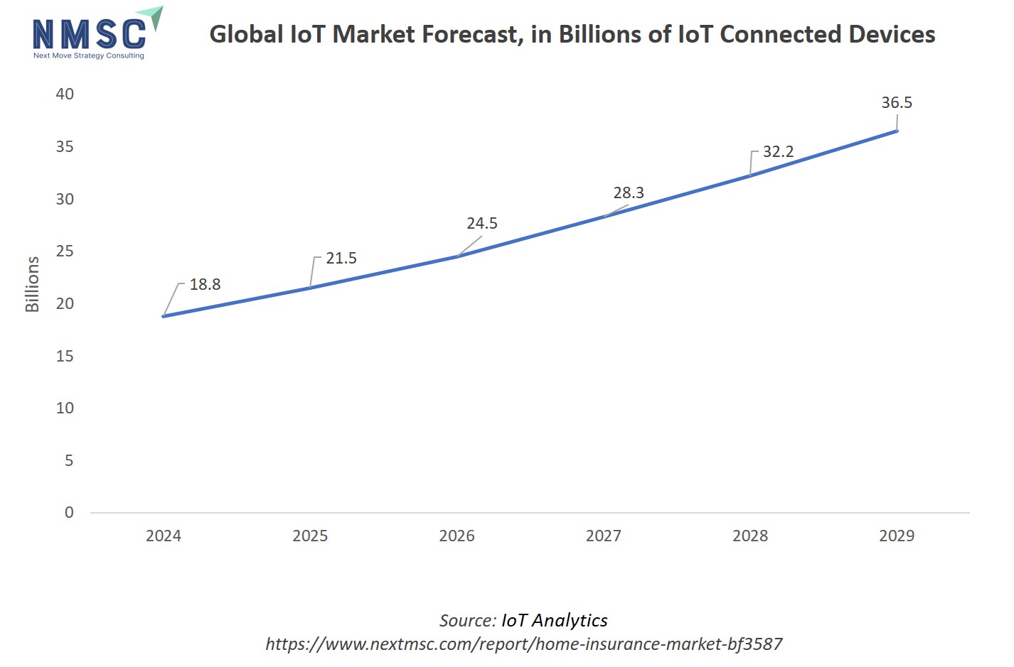 The chart illustrates the global forecast for IoT-connected devices from 2024 to 2029, showcasing substantial and consistent growth over this period. In 2024, there are 18.8 billion IoT devices, which is expected to rise sharply year-on-year, reaching 21.5 billion in 2025, eventually peaking at 36.5 billion in 2029. This steep upward trend underlines the increasing adoption of IoT technology worldwide.