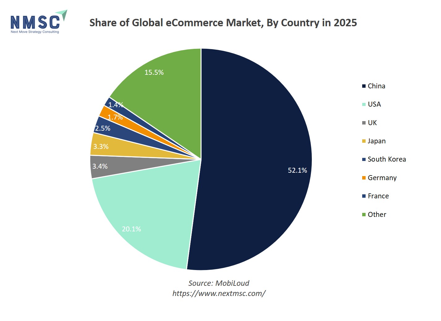 The pie chart depicts the global e-commerce market share by country in 2025, with China leading at 52.1%, followed by the USA at 20.1%. The UK and Japan contribute 3.4% and 3.3%, while South Korea, Germany, and France hold 2.5%, 1.7%, and 1.4%, respectively. The remaining countries collectively account for 15.5% under “Other.” The dominance of e-commerce in countries like China and the USA indicates a significant opportunity for houseware companies to reach consumers through online channels. Digital retail enables convenient access to kitchenware, storage solutions, cleaning tools, and decorative products, particularly for urban and tech-savvy consumers. Markets with smaller e-commerce penetration rely more on physical retail, but global trends suggest growing online adoption is likely to shape houseware distribution strategies worldwide.