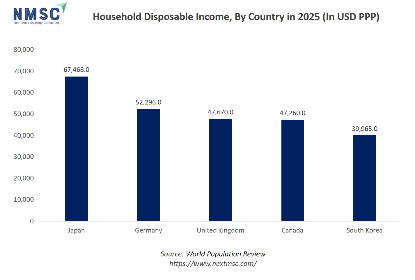The bar chart illustrates household disposable income in USD PPP for selected countries in 2024–2025. Among the countries shown, Japan has the highest per capita disposable income at USD 67,468, followed by Germany at USD 52,296, the United Kingdom at USD 47,670, Canada at USD 47,260, and South Korea at USD 39,965. Higher disposable income in these countries directly correlates with increased spending capacity on houseware products, particularly premium, multifunctional, and design-focused items. Consumers in Japan and Germany are more likely to invest in high-quality kitchenware, serveware, storage solutions, and decorative housewares, driving demand for both innovative and branded products. In contrast, countries with relatively lower disposable income prioritize affordable and essential houseware items, influencing product mix and pricing strategies in the global market.
