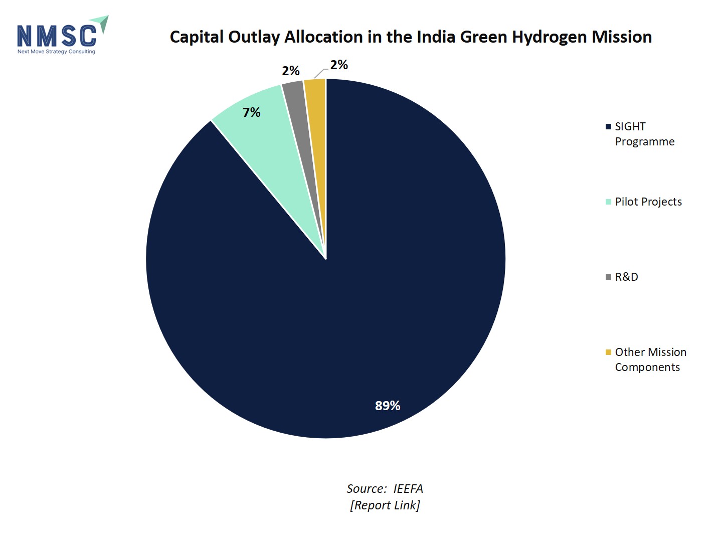 The above chart depicts the capital outlay allocation in India's Green Hydrogen Mission, highlighting that a dominant 89% of funding is directed toward the SIGHT Programme, which is focused on incentivizing the production of green hydrogen and its critical inputs. Pilot Projects account for 7% of the budget, reflecting India's commitment to demonstration and early deployment of green hydrogen technologies. Only 2% each is earmarked for R&D and other mission components, indicating that while research remains important, the primary emphasis is on immediate large-scale implementation and market creation under this ambitious national mission.