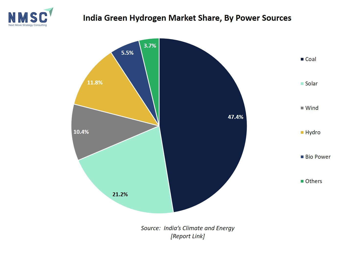 The chart showing India's power sources demonstrates that coal dominates the nation's energy mix at 47.4%, while renewable sources such as solar (21.18%), wind (10.42%), hydro (10.17%), and bio power (5.50%) collectively make up a significant portion of generation. This strong growth in renewables, especially solar and wind, provides the necessary clean electricity backbone required for large-scale green hydrogen production, as green hydrogen relies on abundant, low-carbon electricity for cost-effective electrolysis. As renewables continue to expand their share and fossil dependence declines, India is better positioned to achieve both its decarbonization targets and accelerate the commercial viability and competitiveness of green hydrogen as part of its energy transition strategy.