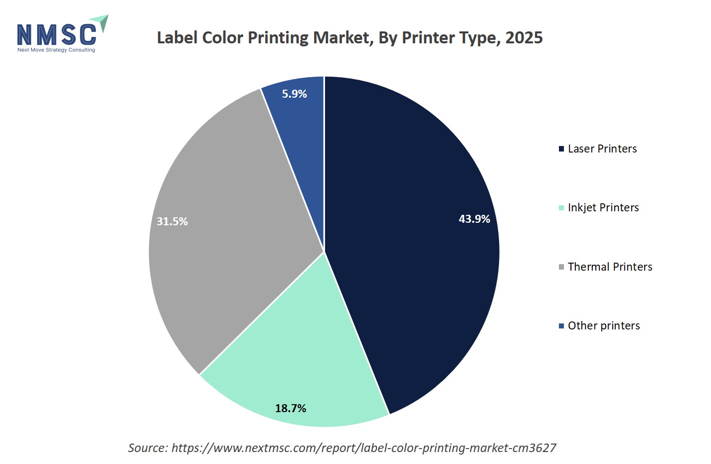 The chart illustrates the label color printing market segmentation by printer type for 2025, showing that laser printers dominate with a 43.9% share, followed by thermal printers at 31.5%, inkjet printers at 18.7%, and other printers at 5.9%. This indicates that while both thermal and inkjet technologies are widely used, laser printers are the preferred choice for label color printing applications globally, reflecting their efficiency, print quality, and reliability within this sector.