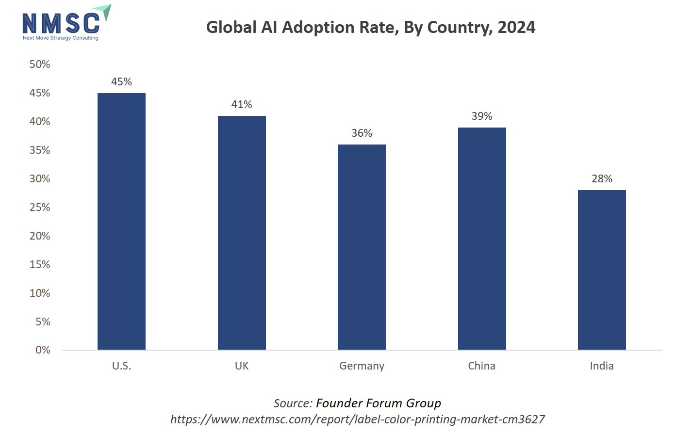 The chart illustrates the global AI adoption rate by country in 2024, with the U.S. leading at 45%, followed by the UK at 41%, China at 39%, Germany at 36%, and India at 28%. Higher AI adoption rates indicate a stronger integration of automation, advanced data analytics, and intelligent supply chain solutions in label color printing market. Countries with higher adoption, such as the U.S., UK, and China, are likely at the forefront of utilizing AI-driven printing technologies for improved efficiency, customization, and quality in label production, while lower adoption in India and Germany means more traditional processes are still prevalent, resulting in slower innovation and fewer competitive advantages in their printing industries.