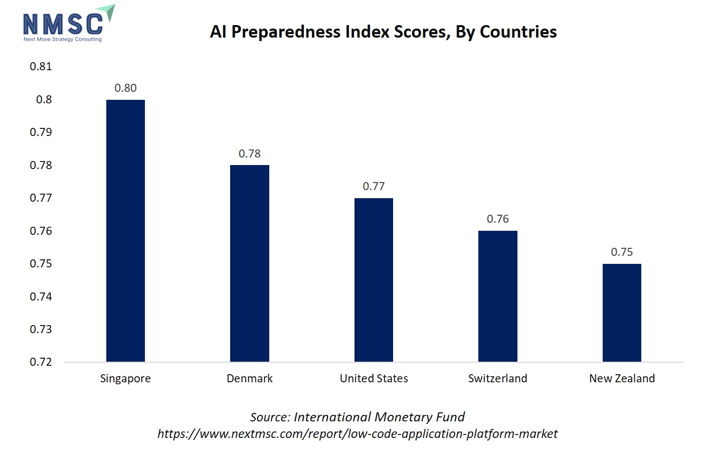 The chart illustrates the AI Preparedness Index (AIPI) scores of the top five countries, with Singapore leading at 0.80, followed by Denmark (0.78), the United States (0.77), Switzerland (0.76), and New Zealand (0.75). This ranking highlights each country's readiness to adopt and integrate AI technologies based on digital infrastructure, human capital, innovation capacity, and regulatory frameworks.