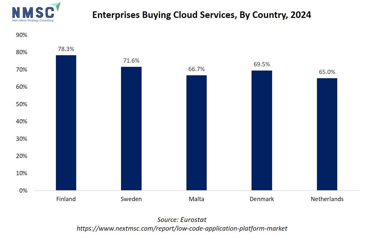 The above chart illustrates the percentage of enterprises purchasing cloud services across five European countries: Finland (78.3%), Sweden (71.6%), Malta (66.7%), Denmark (69.5%), and the Netherlands (65.0%). The data indicates a strong adoption of cloud computing across these regions, highlighting that a majority of enterprises are increasingly relying on cloud-based infrastructure for their IT operations.