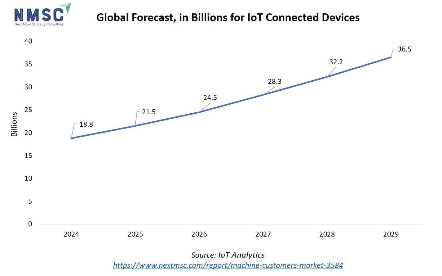 The rapid expansion of IoT endpoints indicates a significant rise in the number of connected machines that can autonomously interact, transact, and deliver services, effectively multiplying the scope of the machine customers market. As IoT adoption rises, businesses gain new opportunities to develop M2M-driven offerings, automate processes, and capitalize on data-rich, connected ecosystems. The chart above shows the accelerating growth in the number of IoT-connected devices globally, projecting an increase from 18.8 billion in 2024 to 36.5 billion by 2029 based on IoT Analytics data.