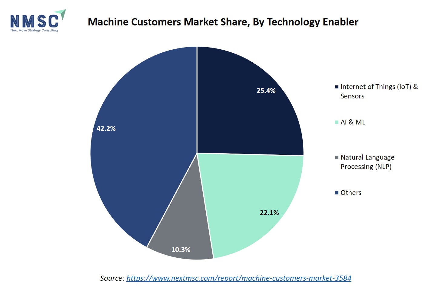 The dominance of IoT & AI highlights the foundational role of connected devices and intelligent automation in driving the machine customer market, while NLP and other emerging technologies are steadily growing their influence, enabling machines to seamlessly interact, transact, and make autonomous decisions across digital commerce and services. The chart illustrates the market share split of machine customers by technology enabler, with IoT & Sensors accounting for 25.4%, AI & ML at 22.1%, Natural Language Processing (NLP) at 10.3%, and the largest segment, Others, at 42.2%.