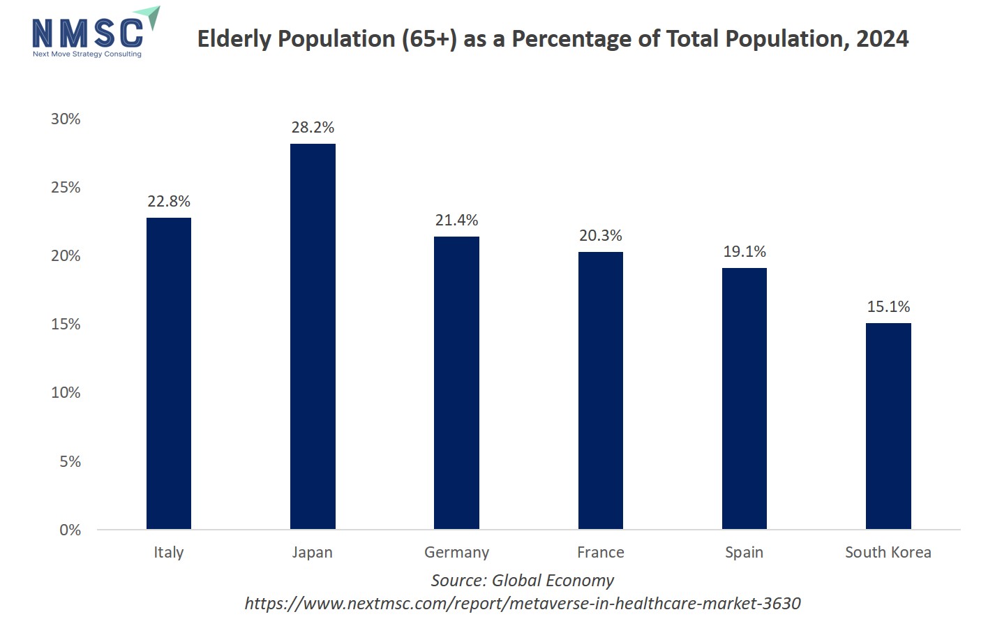 The chart reveals that several major economies, led by Italy and Japan, have over a quarter of their population aged 65 or older, signaling a profound demographic shift. This rapidly expanding elderly demographic directly fuels the metaverse healthcare market by creating an urgent need for scalable, remote care solutions. Technologies like virtual reality for cognitive therapy and pain management, and digital platforms for remote rehabilitation and social connection, are poised to become critical tools for supporting the health and well-being of this aging global population.