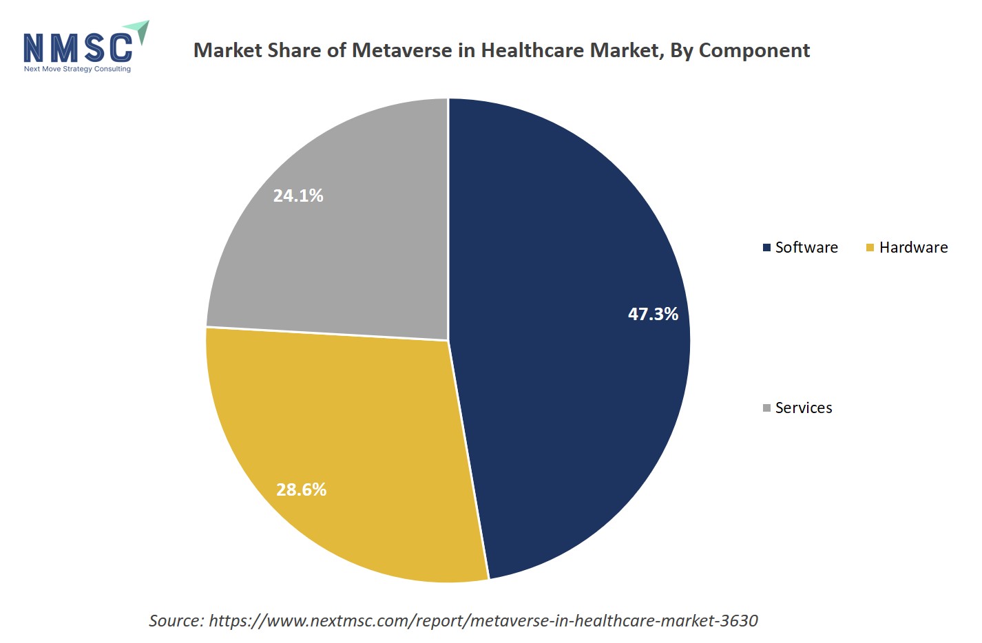 The chart illustrates the metaverse in healthcare market by component, showing that software leads the market, followed by hardware and services. This highlights the critical role of immersive applications and AI-driven platforms in enabling virtual training, patient care, and medical simulations, while hardware and services support practical implementation and adoption. The distribution indicates that balanced investment across software, devices, and services is essential to drive innovation, scalability, and sustained growth in the healthcare metaverse ecosystem.