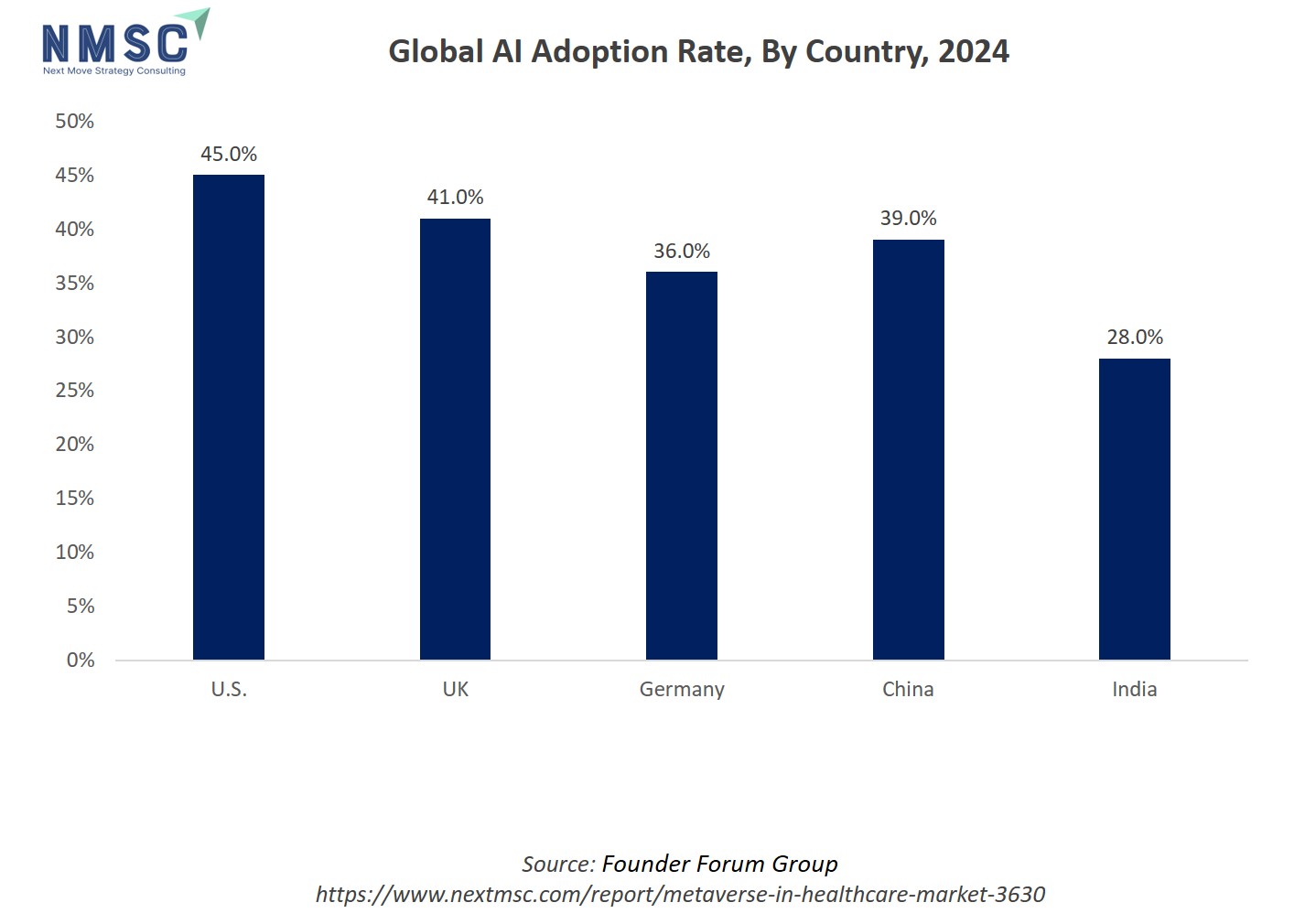 This chart illustrates the AI adoption rate across major economies for 2024, showing the U.S. (45%) and China (39%) as front-runners, while India (28%) trails the group. This rate of AI integration is a critical catalyst for the market, as AI forms the underlying intelligence for immersive environments powering everything from diagnostic avatars and personalized treatment plans to smart patient monitoring. Countries with higher adoption, like the U.S. and China, will likely see accelerated development of sophisticated metaverse healthcare applications, leveraging their strong AI foundations to create more effective and autonomous virtual care systems.