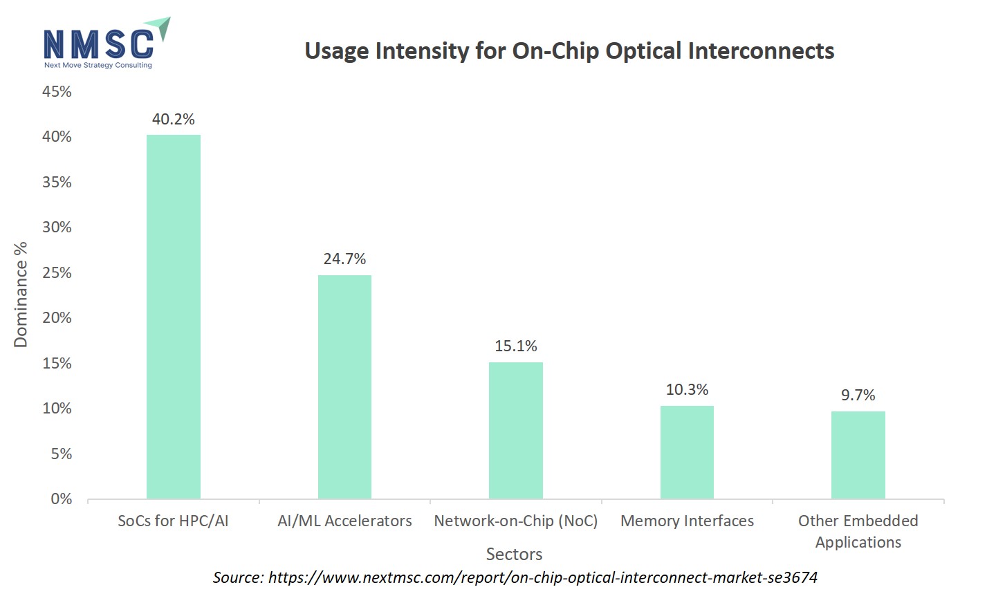 The above chart illustrates the usage intensity of on-chip optical interconnects across different semiconductor sectors. The bar chart shows that SoCs for HPC/AI dominate the usage with a 40.2% share, indicating that high-performance and AI-focused systems are the primary drivers of adoption. AI/ML accelerators follow with 24.7%, reflecting their growing demand for high-speed, low-latency interconnects. Network-on-Chip (NoC) solutions account for 15.1% of usage, while memory interfaces and other embedded applications each represent 10.3% and 9,7%, highlighting their relatively lower but still notable role in leveraging optical interconnect technologies. Overall, the chart conveys a clear hierarchy of sectoral adoption, emphasizing the concentration of usage in high-performance computing and AI domains.