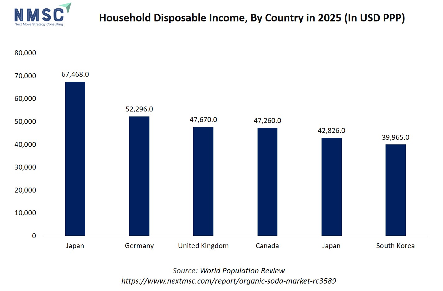 The bar chart highlights household disposable income in USD PPP for selected countries in 2024–2025. Higher disposable income levels correlate strongly with the demand for premium and multifunctional organic soda products, as consumers in affluent markets are more likely to spend on natural, organic, and health-focused beverages. For instance, Japan, with the highest per capita disposable income at USD 67,468, is likely to see strong consumption of premium organic sodas, flavored sparkling water, and functional beverages, while countries like Germany (USD 52,296) and the United Kingdom (USD 47,670) also represent lucrative markets for branded and specialty organic soda offerings.