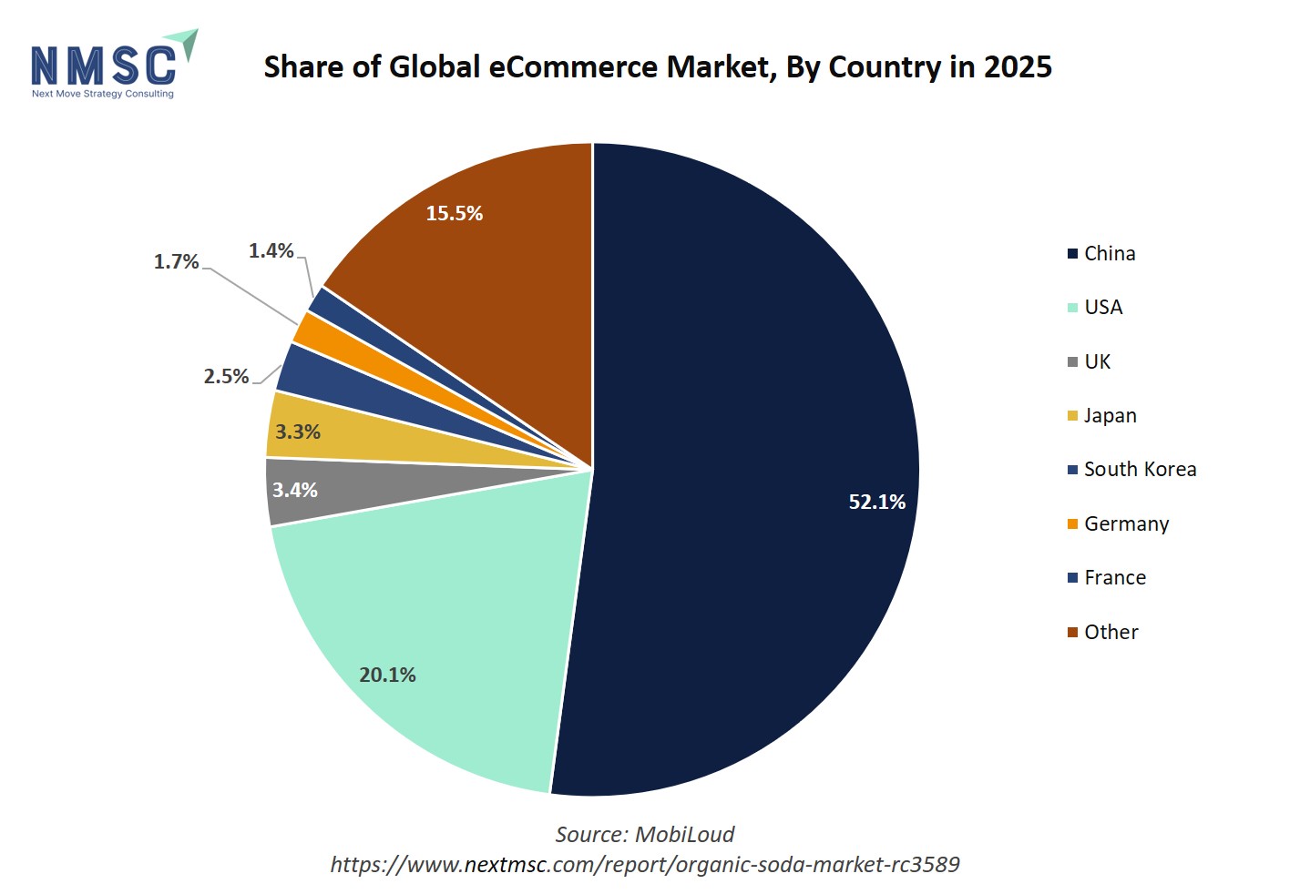 The pie chart showing global e-commerce market share in 2025 highlights the significant role of online channels in shaping consumer markets, including Organic Soda. China, with a dominant 52.1% share of global e-commerce, represents a massive opportunity for Organic Soda brands to reach millions of digitally active consumers. The USA, contributing 20.1%, also offers a strong online market for premium, natural, and innovative functional soda products.