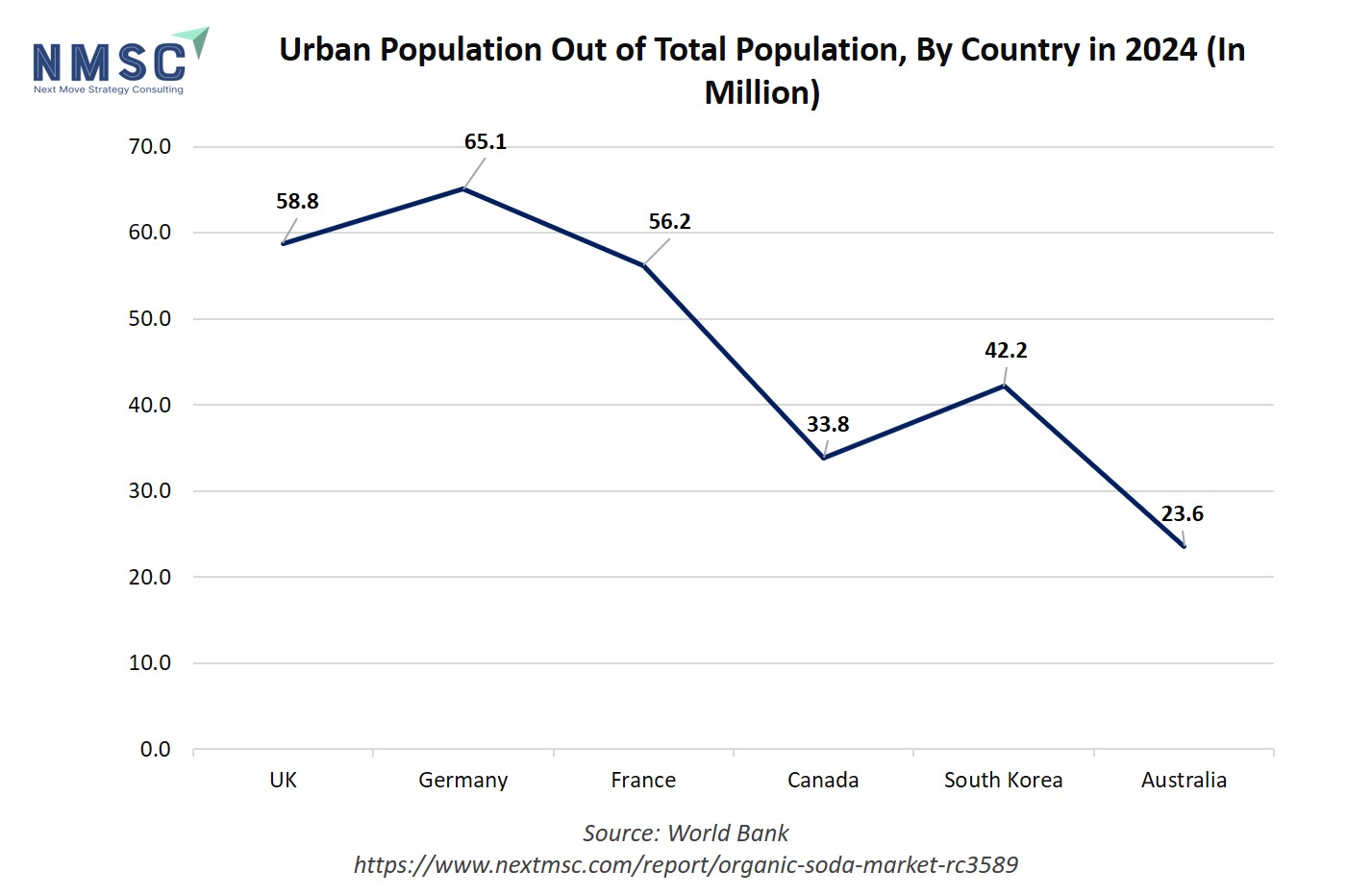 The chart shows the size of the urban population across selected countries in 2024, which directly indicates the potential consumer base for Organic Soda products. For example, Germany (65.1 million), the UK (58.8 million), and France (56.2 million) have large urban populations, suggesting a significant pool of consumers who are more likely to purchase organic sodas due to higher exposure to modern retail outlets, lifestyle trends, and disposable incomes.