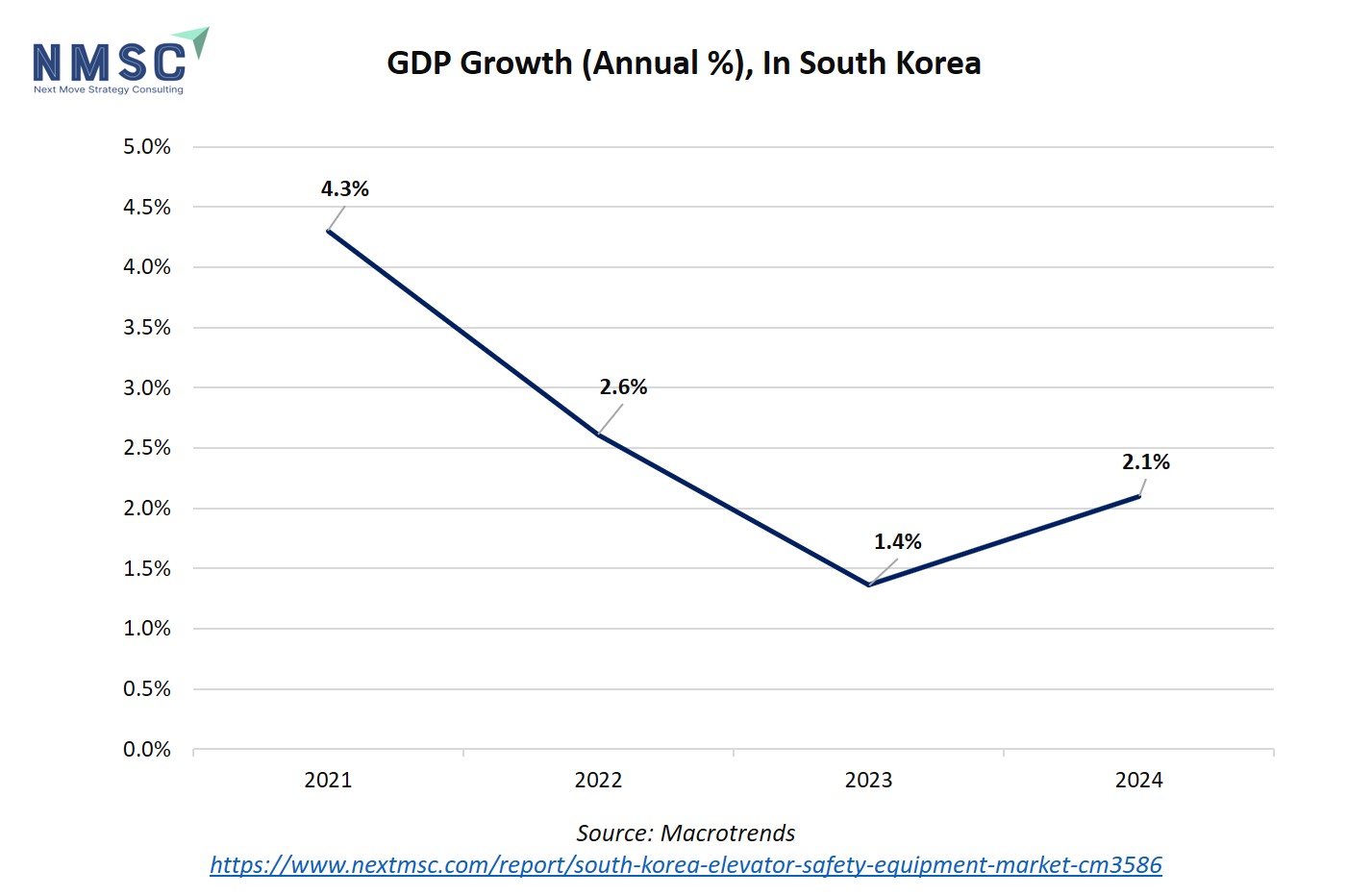 The line graph depicts the annual GDP growth rate (%) of South Korea from 2021 to 2024. After a strong rebound of 4.3% in 2021, following the pandemic-induced slowdown, growth moderated to 2.6% in 2022 and further slowed to 1.4% in 2023, before slightly recovering to 2.1% in 2024. The trend reflects fluctuations in domestic demand, global trade, and macroeconomic conditions impacting the country’s economy.