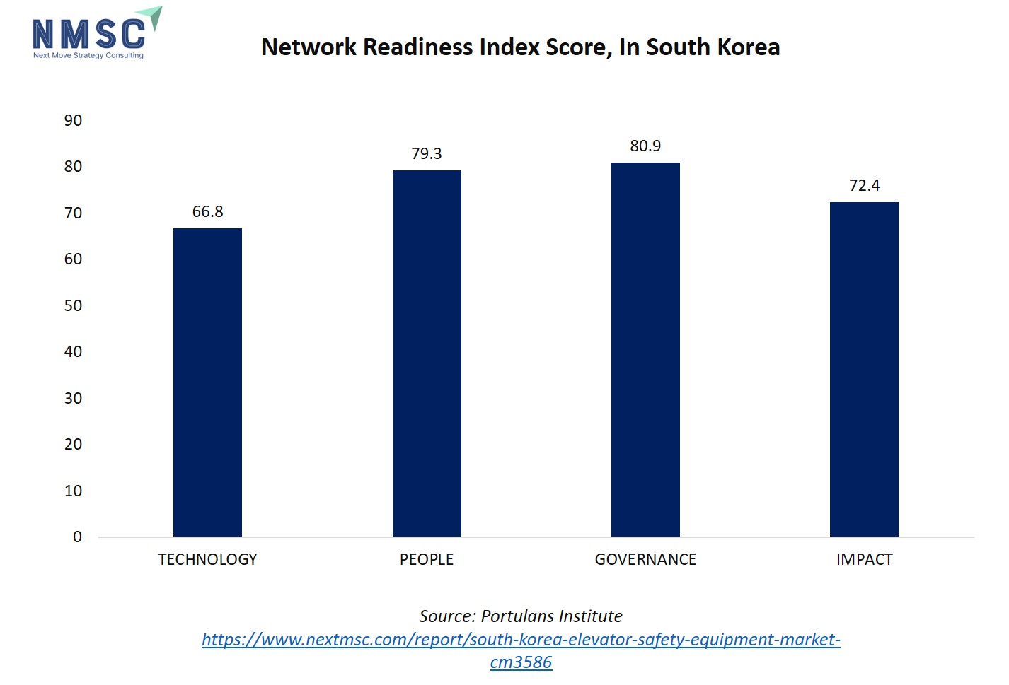 The bar chart illustrates South Korea’s overall score and pillar-wise performance in technology, people, governance, and impact, highlighting the country’s strong foundation for innovation and regulatory compliance. The Technology pillar, scoring 66.78, indicates a high level of technological readiness, supporting the adoption of IoT-enabled, AI-driven elevator safety systems, predictive maintenance tools, and smart monitoring platforms. The People pillar, with the highest score of 79.28, underscores the availability of a skilled workforce and public awareness, ensuring effective installation, maintenance, and compliance. Governance, scoring 80.93, highlights the presence of strict regulatory frameworks and safety standards that drive demand for modern elevator safety equipment. Lastly, the Impact pillar, with a score of 72.4, reflects the importance of reliable vertical transportation in urban high-rises, commercial complexes, and public infrastructure. Collectively, these scores emphasize South Korea’s readiness to adopt advanced elevator safety solutions, positioning the market for sustained growth and innovation.