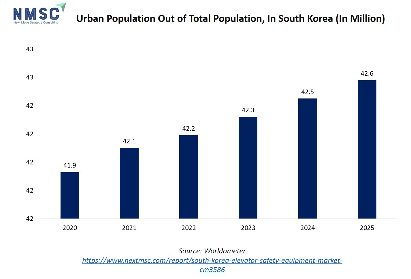 The bar chart illustrates the year-on-year urban population of South Korea, measured in millions, from 2020 to 2025. The data shows a steady upward trend, rising from 41.9 million in 2020 to 42.6 million in 2025, reflecting gradual urbanization across the country. Each successive year records a modest increase, indicating consistent migration to metropolitan areas and expansion of city boundaries. This growing urban population directly impacts the elevator safety equipment market in South Korea.