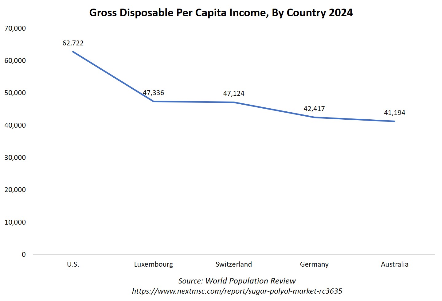 The above chart shows that the U.S., Luxembourg, Switzerland, Germany, and Australia have high gross disposable incomes, which translates to greater consumer spending power. In these countries, strong disposable income directly drives demand for premium, healthier sugar alternatives like polyols, supporting faster market growth for low-calorie and sugar-free products as consumers opt for better dietary choices.