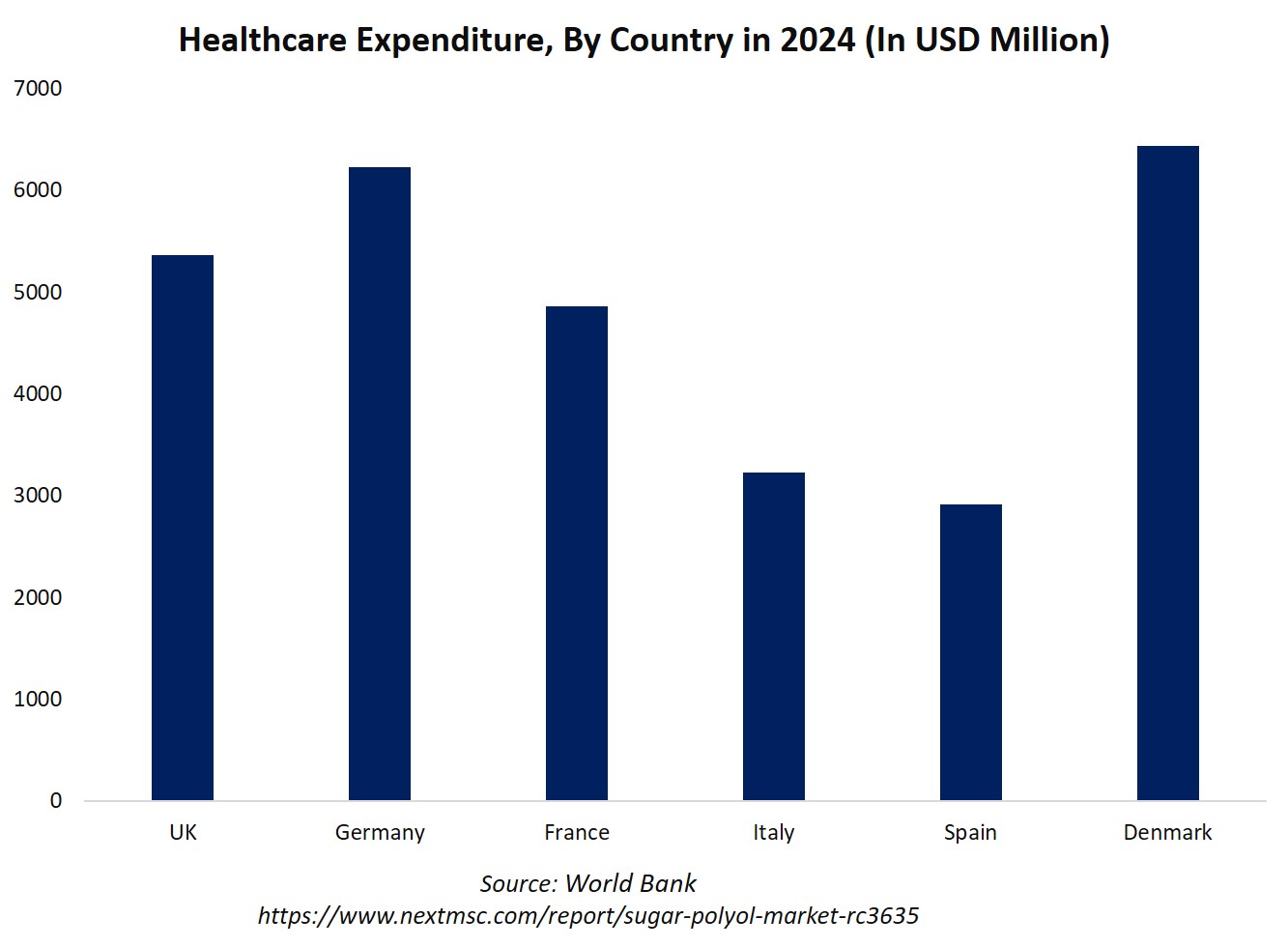 The chart displays healthcare expenditure by country in 2024. High healthcare expenditure in these countries signals greater investment in public health, disease prevention, and health-promoting products, all of which drive demand for healthier sugar alternatives such as polyols.
